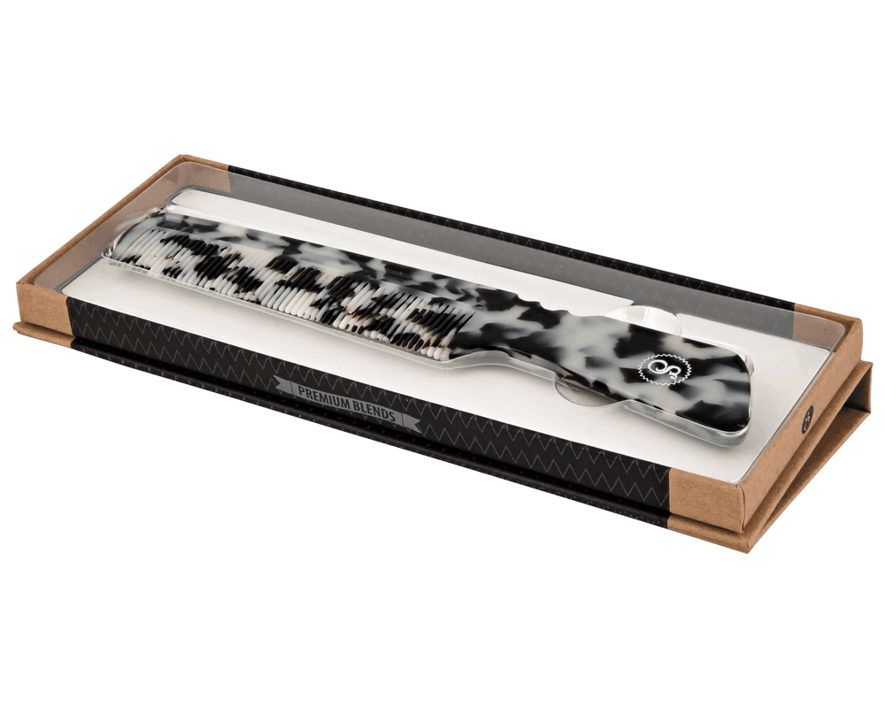 The Premium Blends Black Ivory Handle Comb is a product of years of scouring the globe for some of the best materials and workmanship we could find. This comb, like our efforts to produce it, will travel across the globe with you, along with its sleek profile and portability. The beautiful Cobalt Chip acetate brings out the classic look and sophistication of yesteryear.?